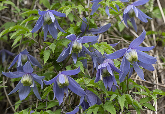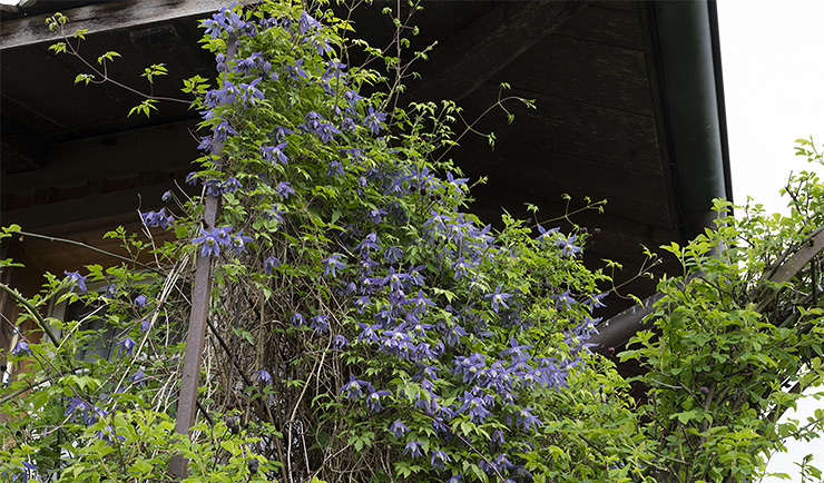 Die Alpenwaldrebe blüht im April/Mai, sie wächst an einer Rankhilfe.