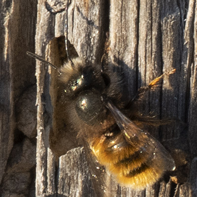 Ein Männchen der gehörnten Mauerbiene sucht eventuell in den verlassenen Käferfrassgängen einen Schlafplatz für die nächste Nacht.