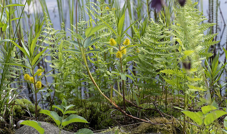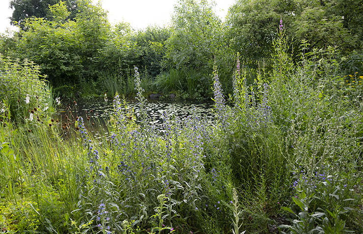 Der ganze Teichrand ist mit verschiedenen Sumpfpflanzen bewachsen